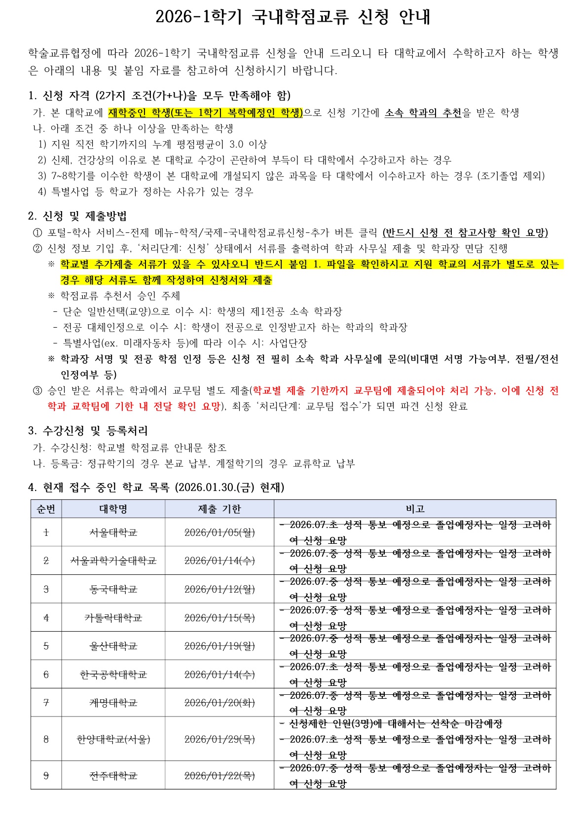 [학사] [학부/학사과정] (26.01.30.) 2026-1학기 국내대학 학점교류 신청 안내